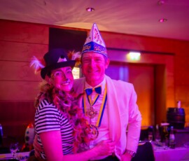 Spät am Abend wurde es nochmal artistisch: Die Kammerkätzchen und Kammerdiener aus Köln zeigten Tanzsport auf höchstem Niveau. Dann wurde es staatshaft: Begleitet von unserem Schutzmann und der Prinzengarde Rot-Weiss zog das Düsseldorfer Prinzenpaar ein. In diesem feierlichen Rahmen wurden noch Orden an den Chef-Adjutanten und die Vertreter des CC verliehen – Ehre, wem Ehre gebührt!