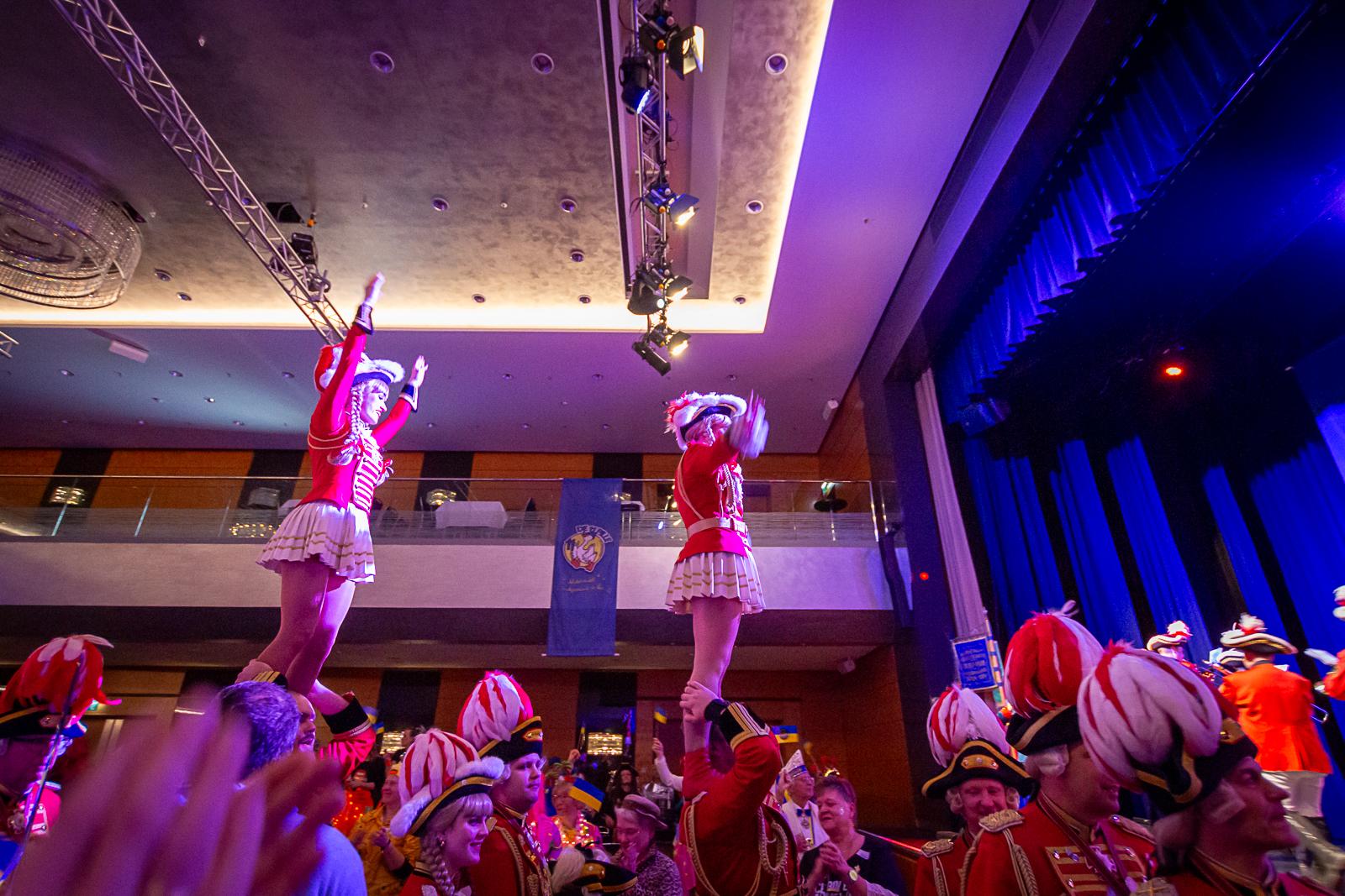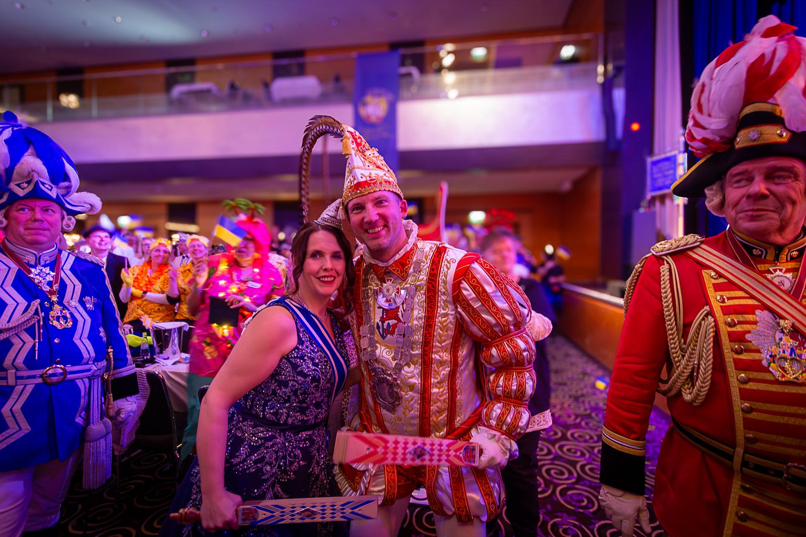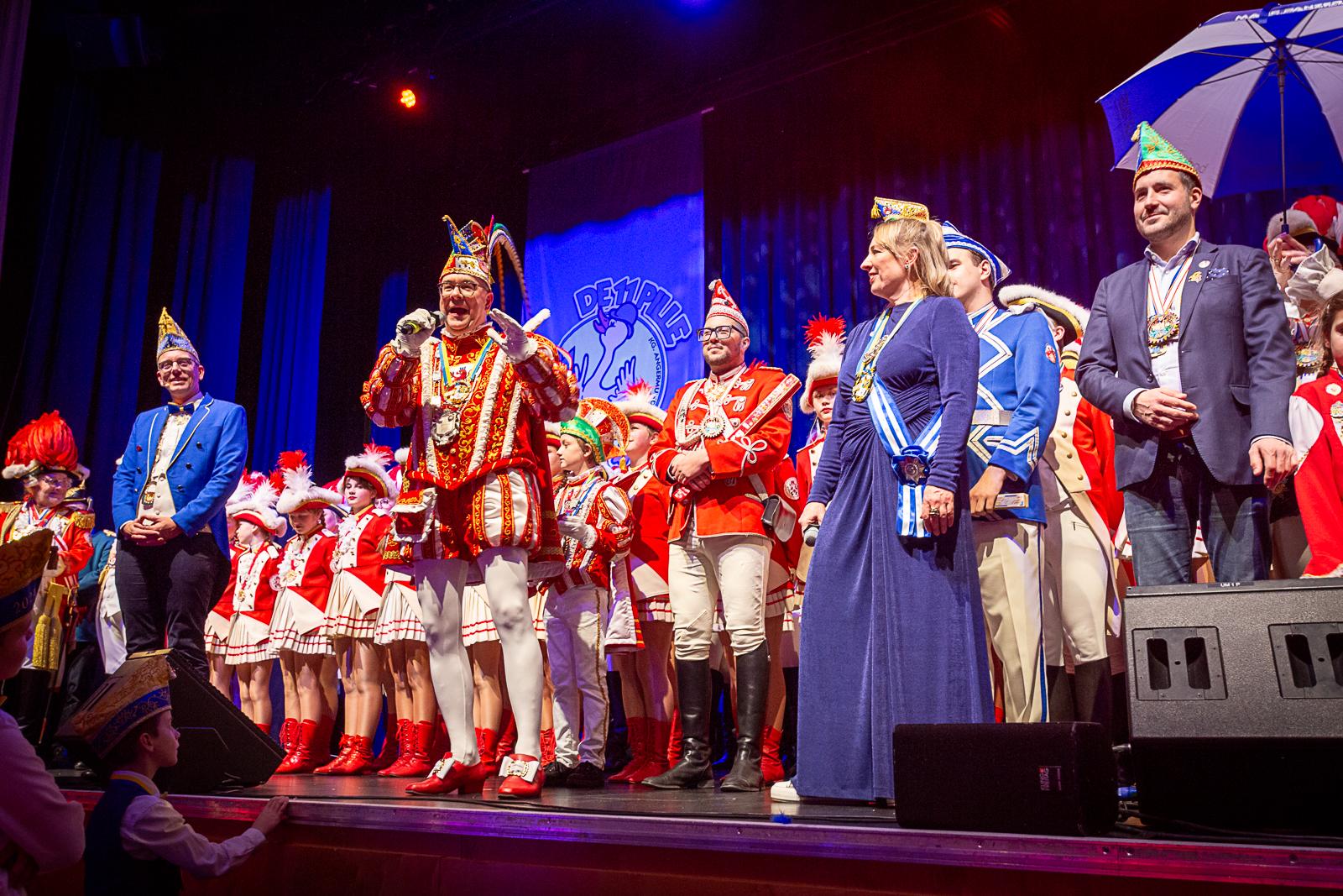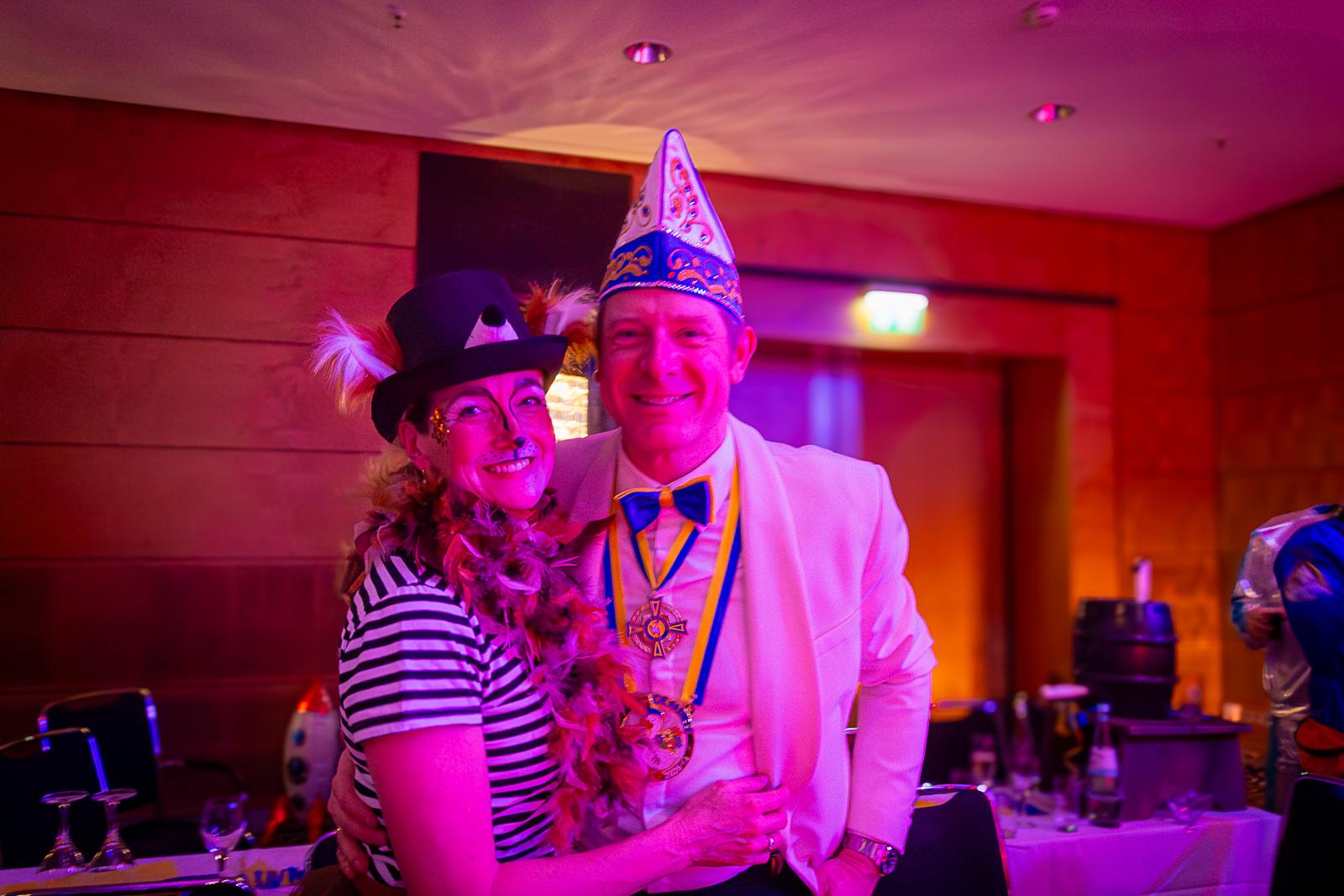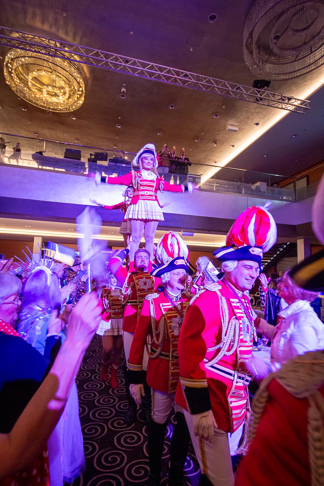 Spät am Abend wurde es nochmal artistisch: Die Kammerkätzchen und Kammerdiener aus Köln zeigten Tanzsport auf höchstem Niveau. Dann wurde es staatshaft: Begleitet von unserem Schutzmann und der Prinzengarde Rot-Weiss zog das Düsseldorfer Prinzenpaar ein. In diesem feierlichen Rahmen wurden noch Orden an den Chef-Adjutanten und die Vertreter des CC verliehen – Ehre, wem Ehre gebührt!