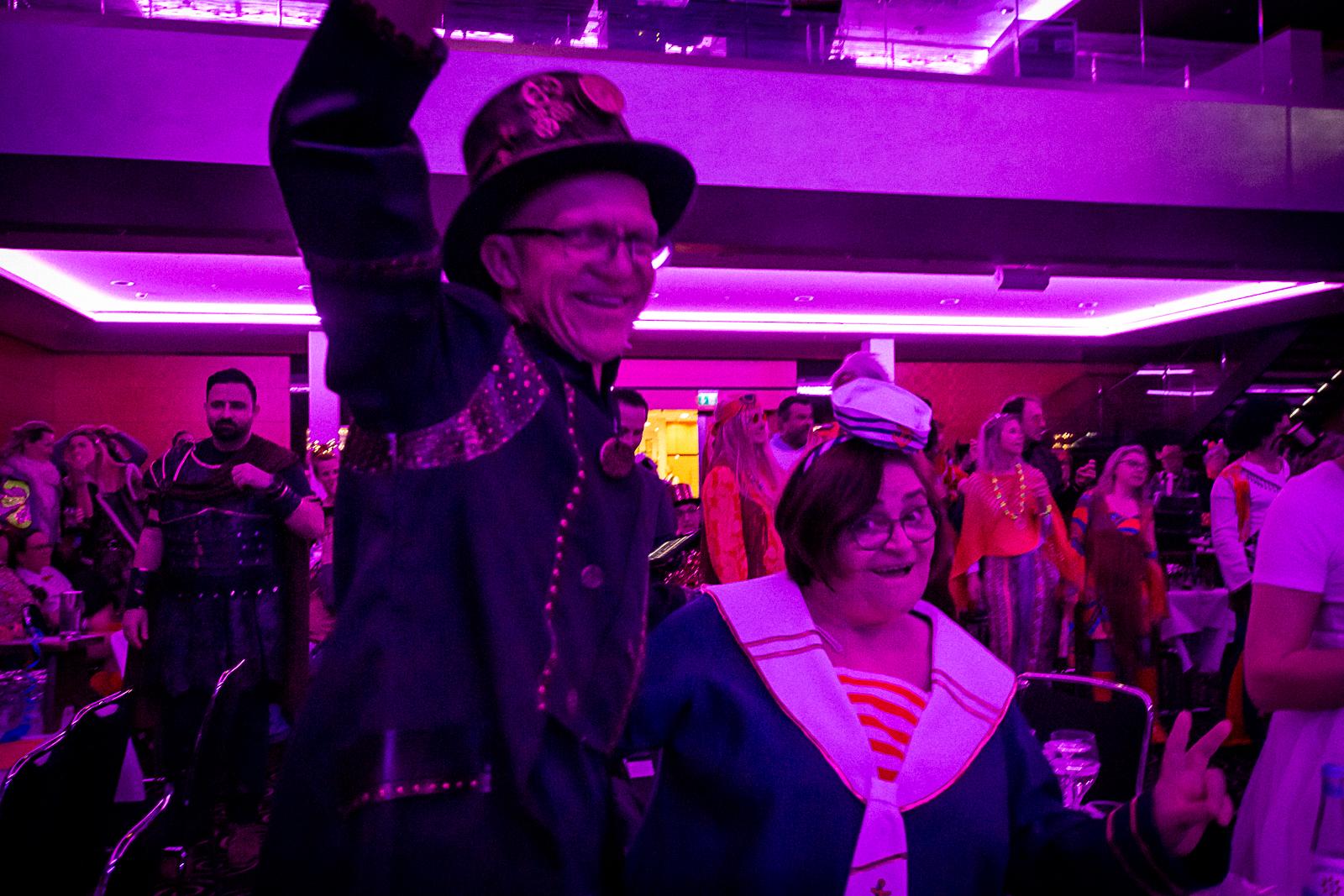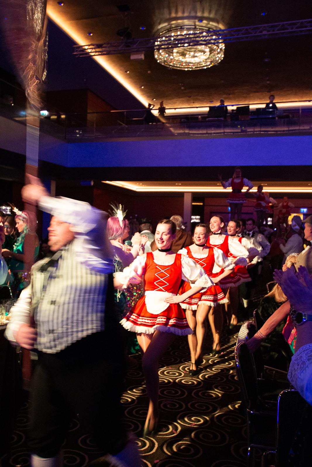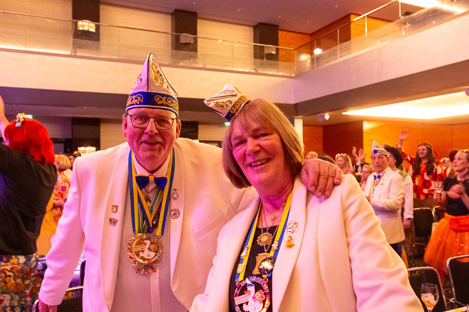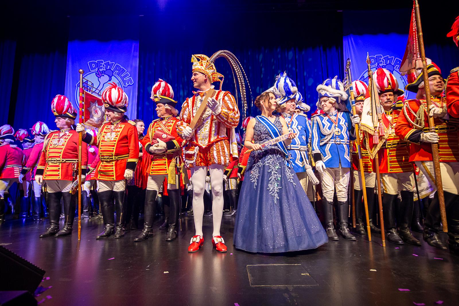 Spät am Abend wurde es nochmal artistisch: Die Kammerkätzchen und Kammerdiener aus Köln zeigten Tanzsport auf höchstem Niveau. Dann wurde es staatshaft: Begleitet von unserem Schutzmann und der Prinzengarde Rot-Weiss zog das Düsseldorfer Prinzenpaar ein. In diesem feierlichen Rahmen wurden noch Orden an den Chef-Adjutanten und die Vertreter des CC verliehen – Ehre, wem Ehre gebührt!